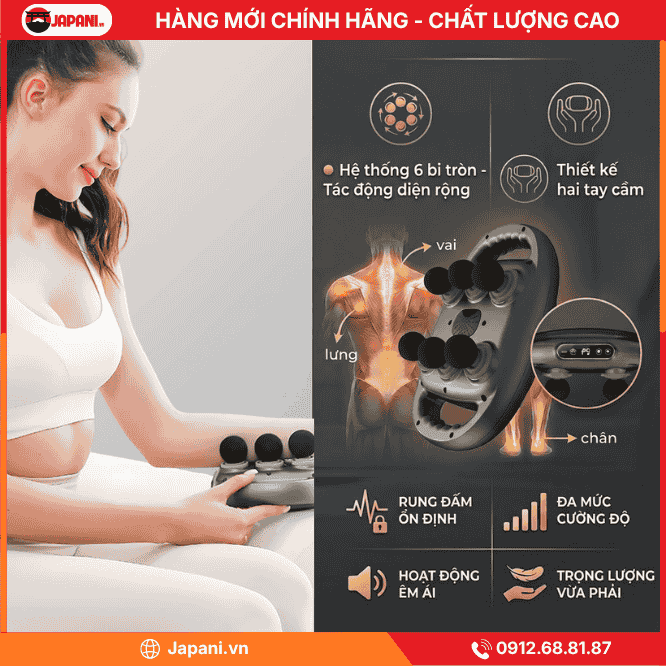 Máy massage cầm tay đa năng JAPANI MDN-7091 sử dụng công nghệ rung đấm cơ học với 6 đầu massage hoạt động đồng thời. Khi vận hành, động cơ tạo ra dao động liên tục giúp các đầu bi tròn tác động trực tiếp lên vùng cơ, hỗ trợ làm giãn cơ và giảm tình trạng căng cứng. Cơ chế rung đa điểm giúp lực massage phân bổ đều trên diện tích rộng, mang lại cảm giác thư giãn nhanh chóng.