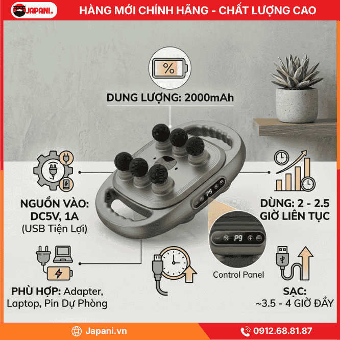 Thời gian sạc đầy của máy khoảng 3,5 đến 4 giờ. Sau khi sạc đầy, thiết bị có thể hoạt động liên tục trong khoảng 2 đến 2,5 giờ tùy theo mức cường độ rung sử dụng. Hiệu suất pin này đáp ứng tốt nhu cầu massage cá nhân hàng ngày và thuận tiện khi mang theo sử dụng ở nhiều môi trường khác nhau.