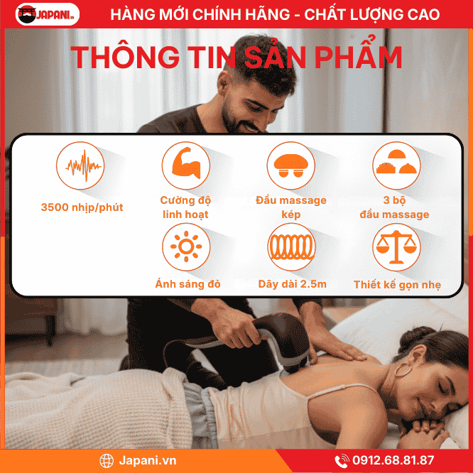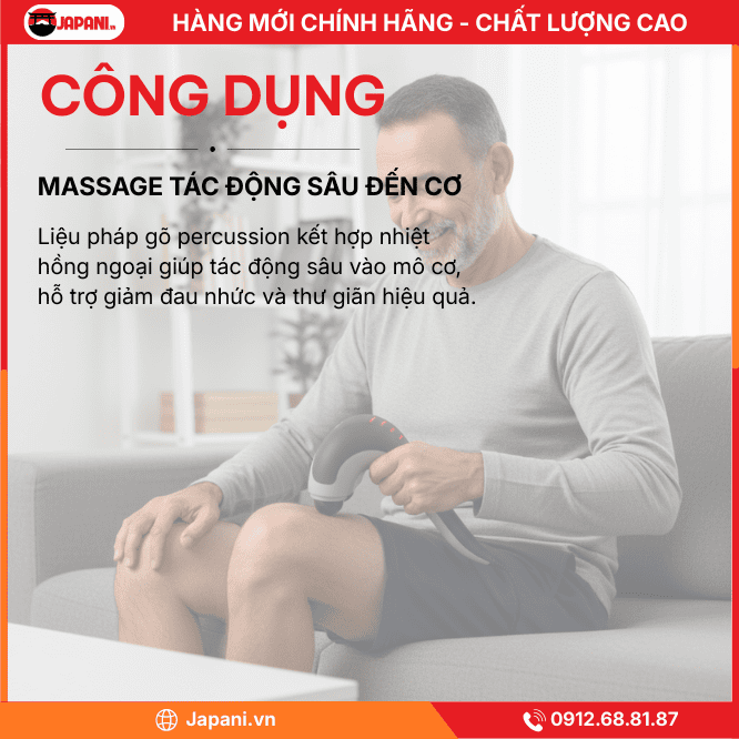 Sản phẩm ứng dụng liệu pháp gõ percussion kết hợp nhiệt hồng ngoại, giúp tác động sâu vào mô cơ, hỗ trợ giảm đau nhức và thư giãn hiệu quả trong quá trình sử dụng.