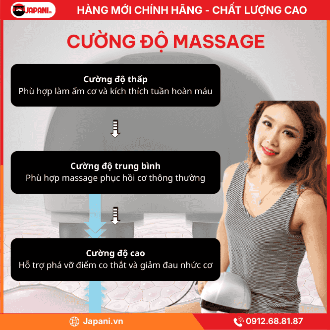 - Cường độ trung bình: Lực gõ vừa phải, tác động sâu hơn vào mô cơ, giúp giảm căng cứng vai gáy, lưng và bắp tay. Phù hợp sử dụng sau giờ làm việc, vận động nhẹ hoặc massage phục hồi cơ thông thường.
